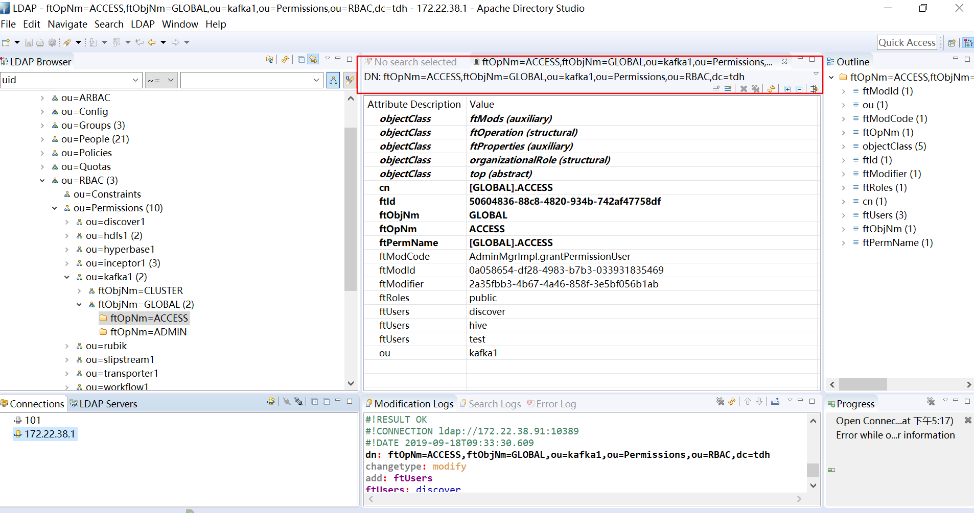 ldapsearch -H ldap://localhost:10389 -x -D uid=admin,ou=system -w 123456 -b "ftOpNm=ACCESS,ftObjNm=GLOBAL,ou=kafka1,ou=Permissions,ou=RBAC,dc=tdh" -