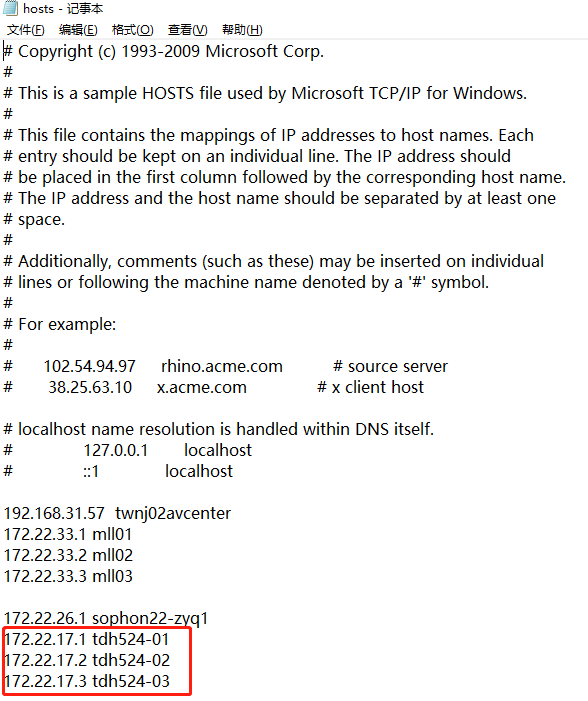 将集群所有服务器的的IP地址和域名,通过管理员权限添加在hosts文件中。