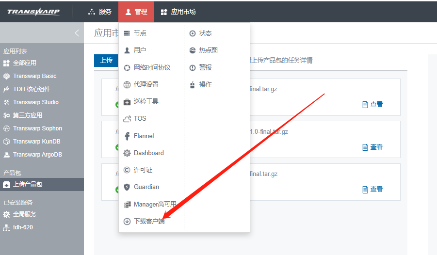 在Manager 8180页面,点击 应用市场 > 上传产品包,然后重新上传 TDH-Image-Registry-Transwarp-xxx-final.tar.gz 产品包 - 从其他集群复制一份过来;