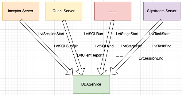 DBAService中的和Query相关,Server/Executor状态等监控数据都是来自Quark Server,Quark Server通过leviathan-message(封装了akka的消息框架)发送监控埋点数据给DBAService。