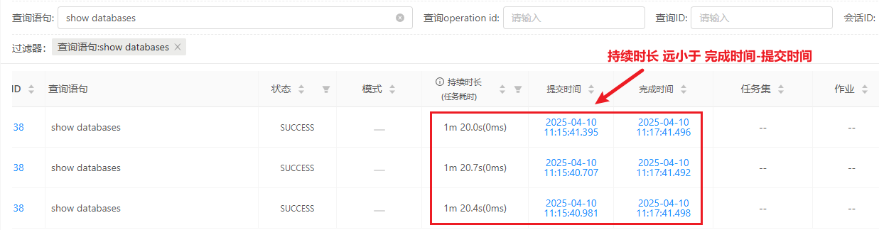 建议:升级到DBAService 9.4.3 + 最新patch,不再有postrun状态,将该阶段拆分为最关键的两个阶段:FILECOMMIT 和 FETCHRESULT,对于FETCHRESULT阶段,通过 select * from system.processes_v 检查SQL执行状态,如果存在该SQL且该SQL的状态为FINISHED,则给当前SQL增加一个标记 FINISHED。