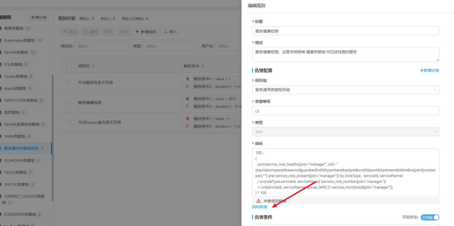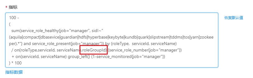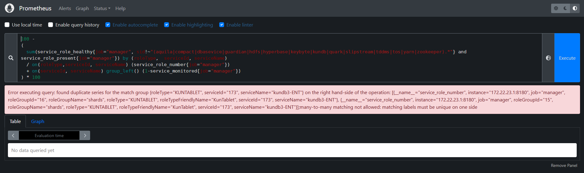 Aquila 9.3.5 版本,服务通用告警规则组 – 服务健康检测 – 指标数据 进入, Prometheus 执行报错 Error executing query: found duplicate series for the match group {roleType="KUNTABLET", serviceId="173", serviceName="kundb3-ENT"} on the right hand-side of the operation: [{__name__="service_role_number", instance="172.22.23.1:8180", job="manager", roleGroupId="16", roleGroupName="shards", roleType="KUNTABLET", roleTypeFriendlyName="KunTablet", serviceId="173", serviceName="kundb3-ENT"}, {__name__="service_role_number", instance="172.22.23.1:8180", job="manager", roleGroupId="15", roleGroupName="shards", roleType="KUNTABLET", roleTypeFriendlyName="KunTablet", serviceId="173", serviceName="kundb3-ENT"}];many-to-many matching not allowed: matching labels must be unique on one side