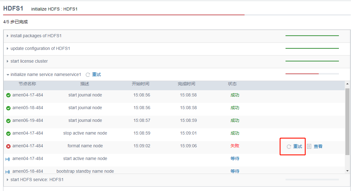 TDH4.X 的版本,删除 HDFS,重新安装的时候,在执行到 initialize name service nameservice1 > format name node 步骤时会报错,报错内容如下: