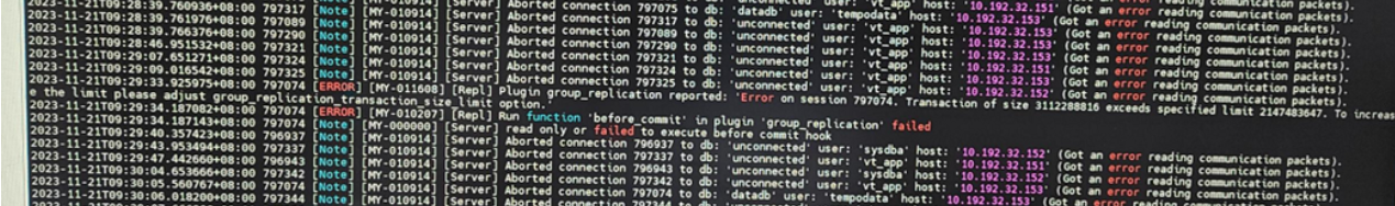 - 触发原因:单个事务生成的二进制日志(binlog)或写集(writeset)超过了组复制的限制。