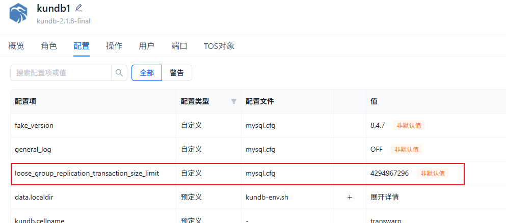 kundb组件,新增自定义参数 loose_group_replication_transaction_size_limit,值为4294967296,(也就是4G),配置服务并重启。