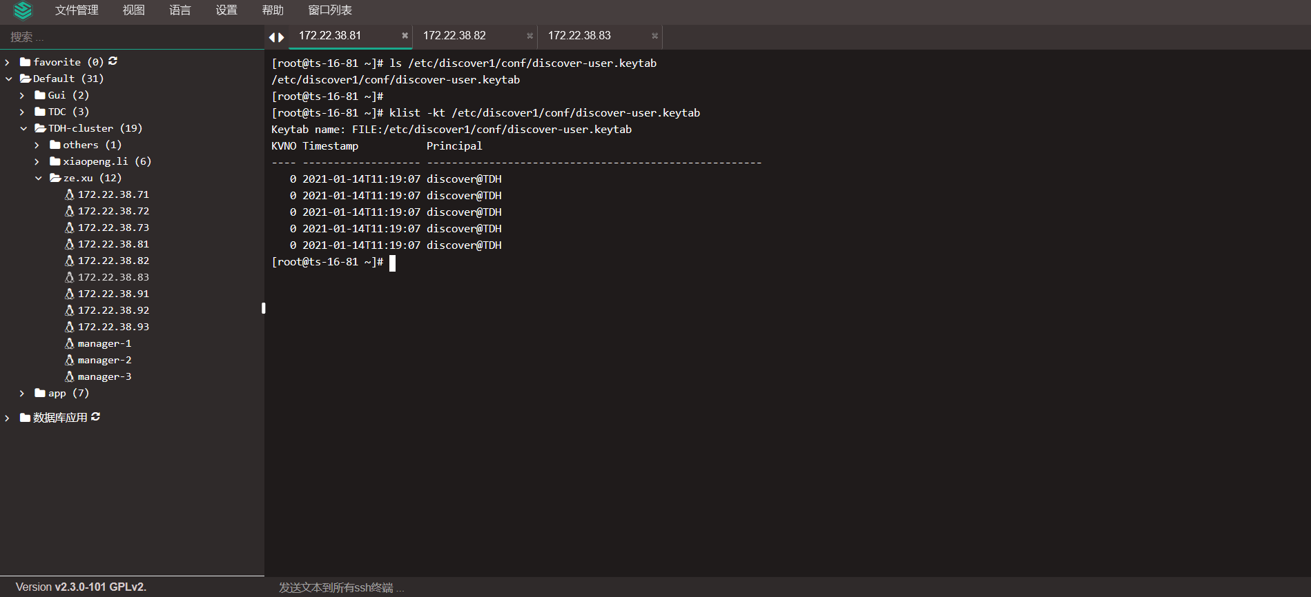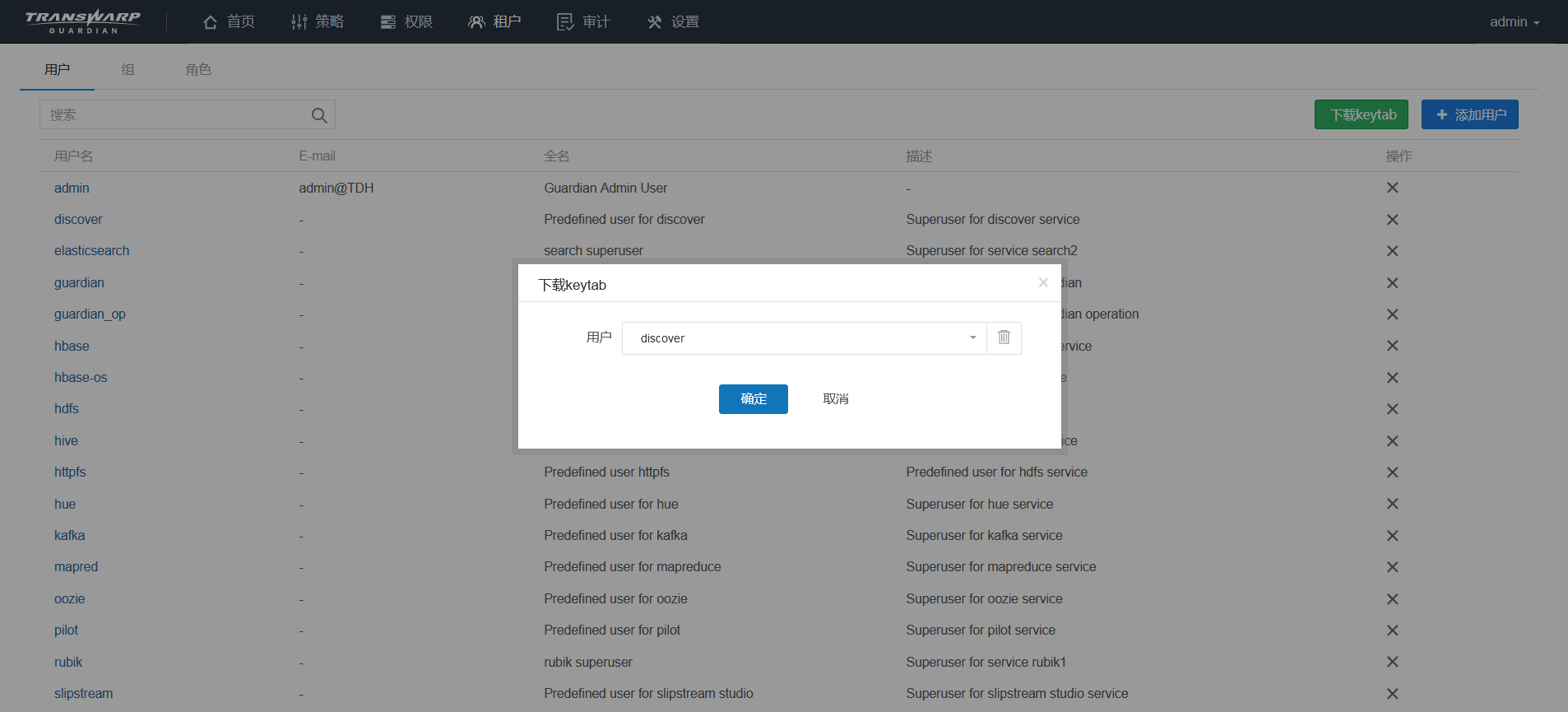下载租户discover的keytab,并上传到ide角色所在节点/etc/discover1/conf/discover-user.keytab