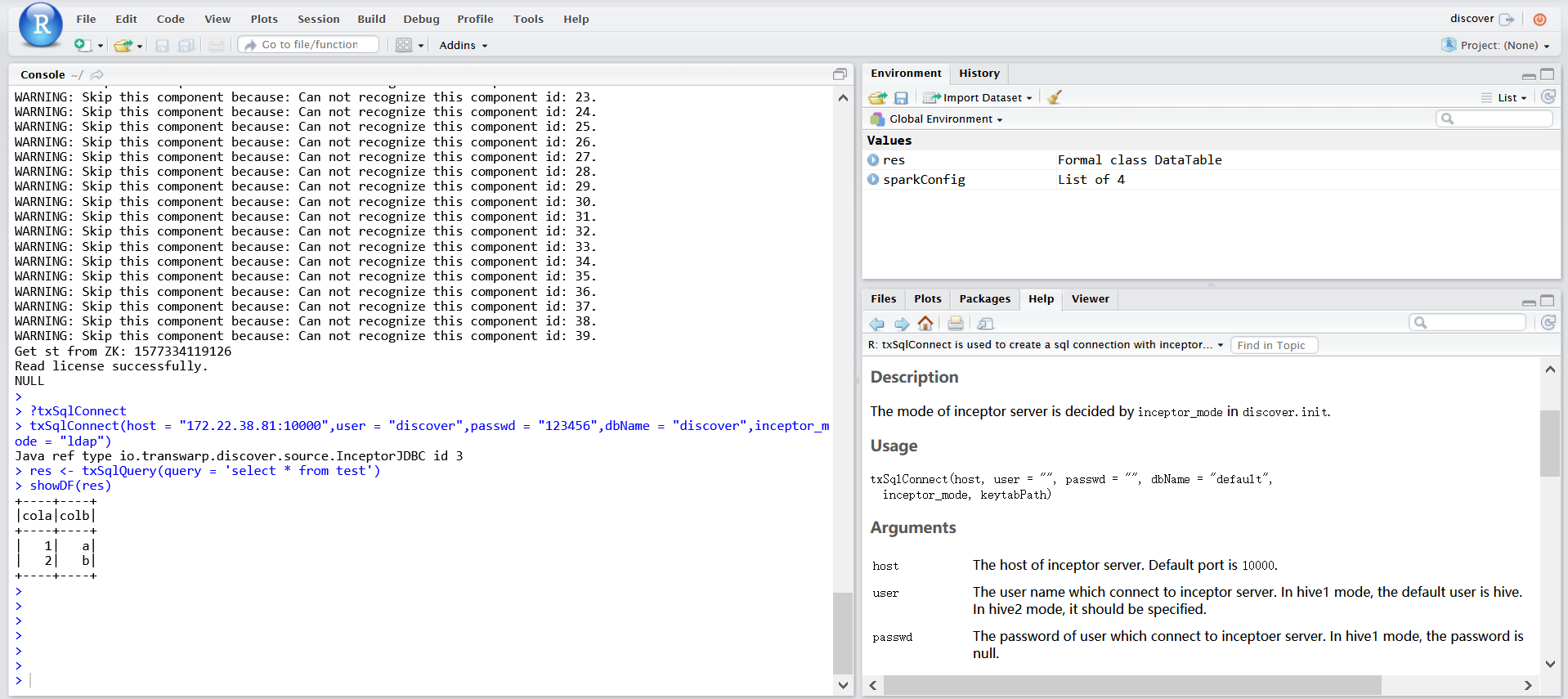 txSqlConnect(host = "172.22.38.81:10000",user = "discover",passwd = "123456",dbName = "discover",inceptor_mode = "ldap")