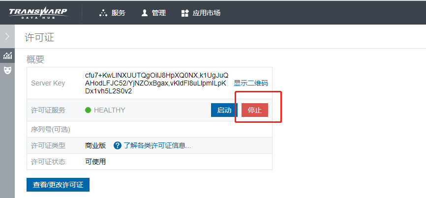 在 Manager 页面,点击 管理 > 许可证 > 停止 按钮