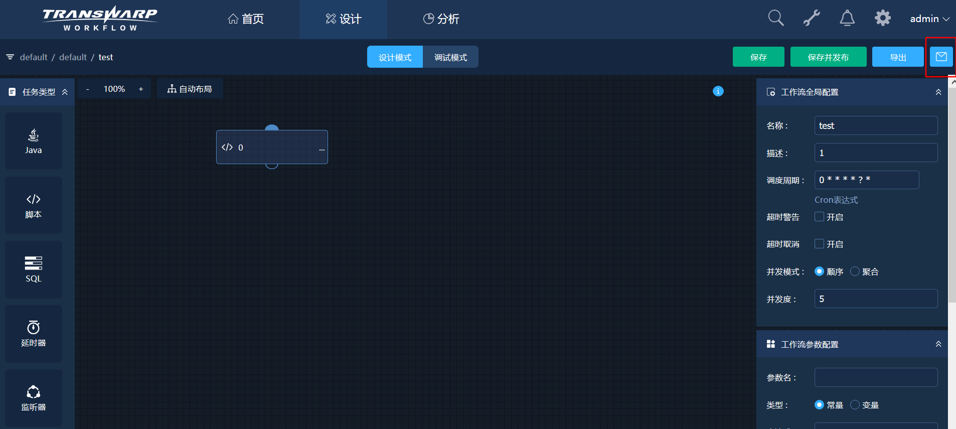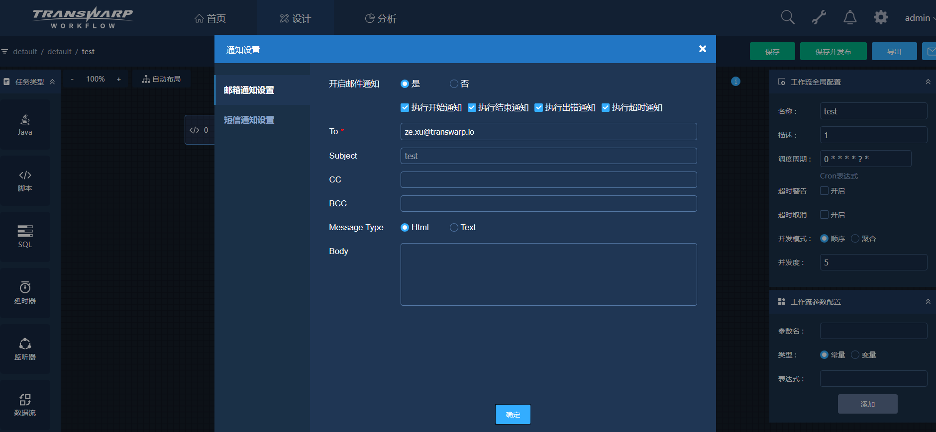 工作流设计页面右上角点击通知设置